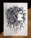 Lino print - Gorgoneion - hand printed with black ink on beige colored paper
