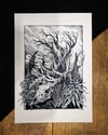 Lino print - "The Dragon" - hand printed with black ink on cream colored handmade paper